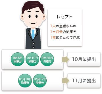 2. 患者さんの加入する医療保険の保険者が同一月中に替わった場合は保険者毎に作成する - 作成したレセプトは治療月の翌月に提出することが原則(9月の治療分は10月に提出)。