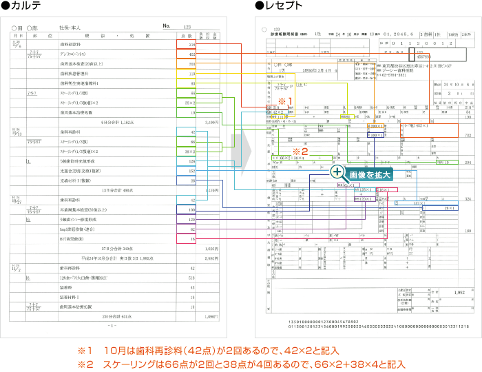 カルテに記載された保険治療の内容を確認し、レセプト用紙の所定の欄に保険点数を転記します。
