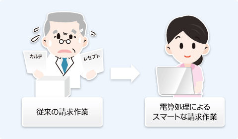 歯科用レセプトコンピュータを利用することで、編綴作業や診療報酬請求書の作製 等の総括作業を自動でおこなってくれます。