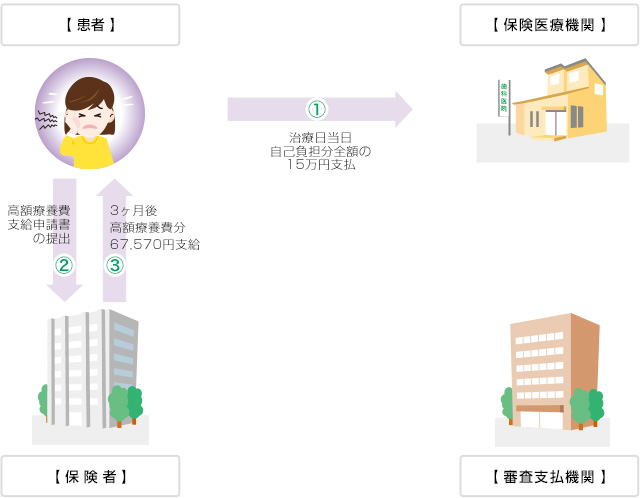 自己負担分全額を医療機関の受付で支払い、後日 患者さんが加入している保険者に「高額療養費支給申請書」を提出します。約3ヶ月後に高額療養費による補助が振り込まれます。