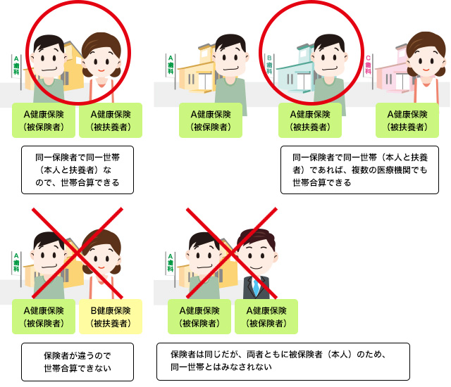 し、合計が自己負担限度額を超えた場合に、高額療養費の世帯合算を受けることができます。