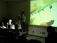 また、同様にデモンストレーションとして、大分県所属の肥川憲一郎先生により、「グラディアフォルテの審美と臨床」のテーマにて、臼歯ジャケットクラウンの築盛から研磨までの製作過程を通じ、審美性の高い色調表現方法やコツ、使用上の注意点、などについて実演いただきました。