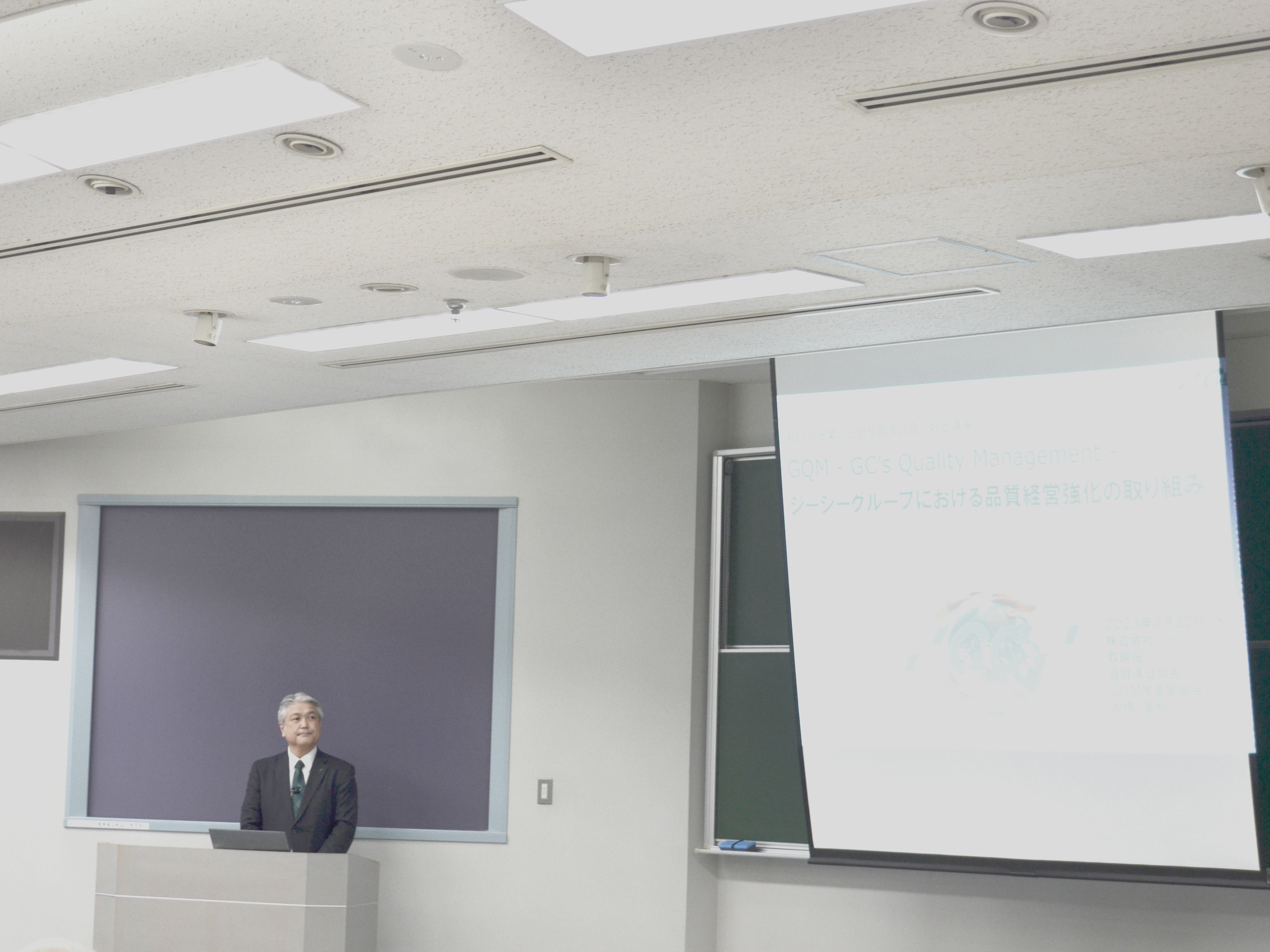 また報告講演では弊社取締役 品質保証部長 GQM推進担当の船橋英利が「GQM -GC’s Quality Management – ジーシーグループにおける品質経営強化の取り組み」と題し、企業文化でもある「なかま」「しくみ」「風土」における「品質経営強化のためのグローバル重点活動」「近年の企業品質への取り組み」「今後の活動」について実例とともに紹介いたしました。