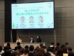 最初に、天野敦雄先生に「臨床予防歯科最前線 なるほどなっとく!う蝕と歯周病のメカニズム」と題して、お二人目は、福原あゆみ先生に「患者さんとともに取り組む歯周治療」と題して、そして、小林明子先生に「生涯メインテナンスを支える歯科衛生士のミッション」と題してご講演をいただき、最後に会場からいただいたご質問に対し、3名の先生にご回答をいただきました。