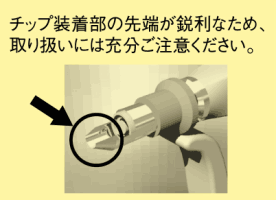 ユニチップガンはチップ装着部の先端が鋭利な形状をしておりますので,ユニチップが装着されていない状態での取り扱いには充分ご注意ください。
