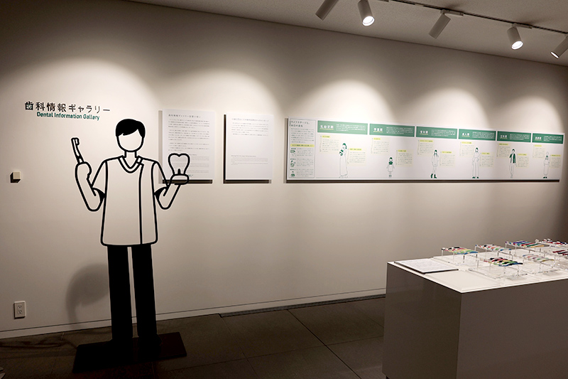 1階エントランスロビーには、「歯科情報ギャラリー」を新設いたしました。当施設は、一般の皆様にお口の健康の大切さを感じていただき、より多くの関心をもっていただくことを目的とし、ライフステージにおけるお口の変化とその対応を解説したパネルやセルフケア製品などを展示しております。この施設での経験をきっかけに、お口の健康を保っていただき、地球市民の皆様の幸せな人生の一助となることを願っております。