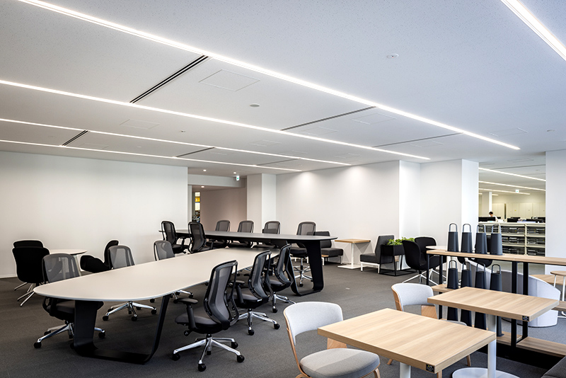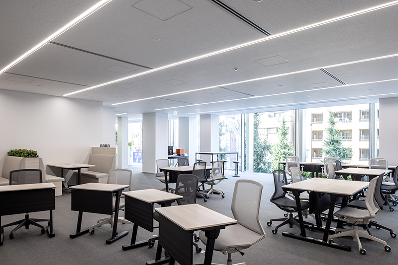 2~4階の増設されたオフィスフロアでは、「イノベーションを生み出すオフィス空間の創出」を基本コンセプトに、働く人が気分転換したいときや、心地よく働きたいときに使えるエリア、チームでアクティブに働くときやじっくり話したいときなど集い語り合う場面に最適なエリアを設置しました。
