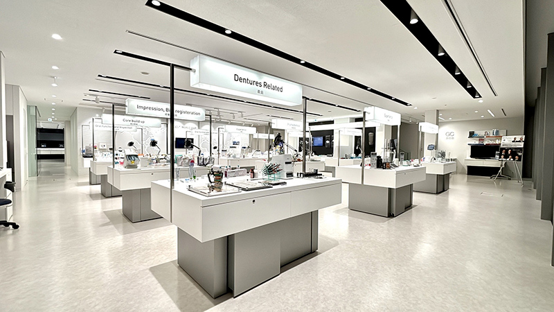 拡張・全面改装された6階ショールーム(シミュレーションフロア)では、歯科臨床に必要な製品を直接触れて体験していただくことにより、製品コンセプトや歯科臨床を総合的に支える製品ラインナップを実感していただける展示構成となっております。また、実際の診療区分をイメージしていただきながら製品をお試しいただけます。