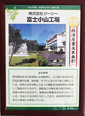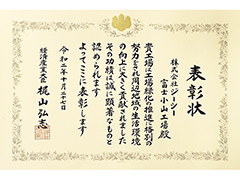 当社の主力工場である富士小山工場(静岡県駿東郡小山町)が、緑化優良工場等表彰「経済産業大臣賞」を受賞し、2020年11月13日 富士小山工場において、取締役工場長の鈴木義政が関東経済産業局職員より表彰状を授与されました。