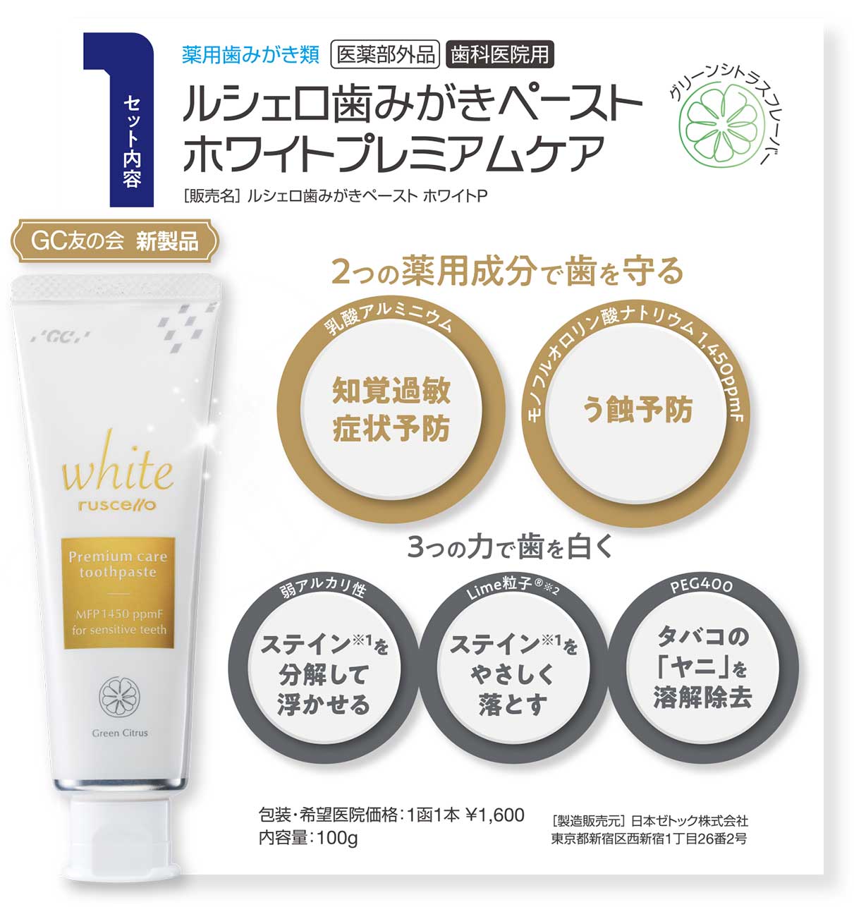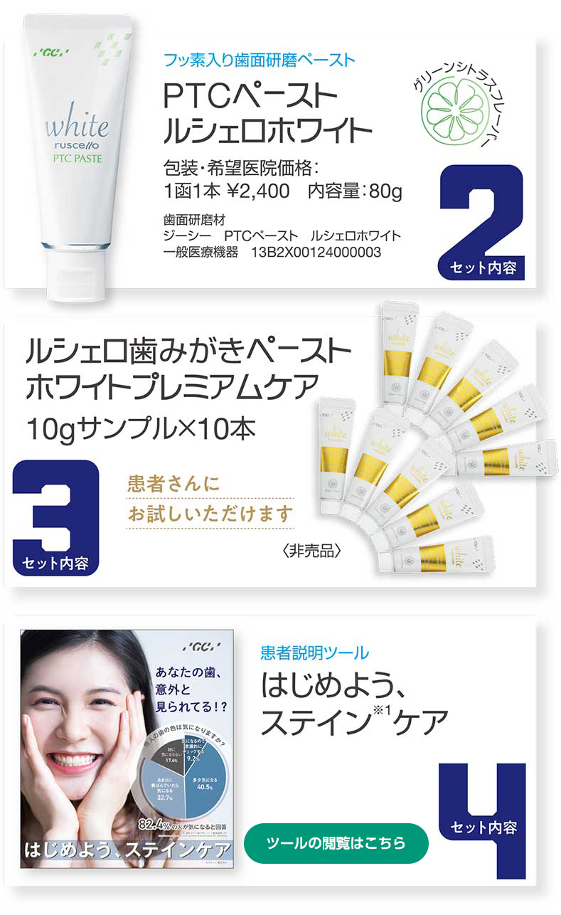 ②フッ素入り歯面研磨ペースト「PTCペーストルシェロホワイト」