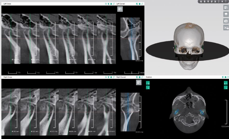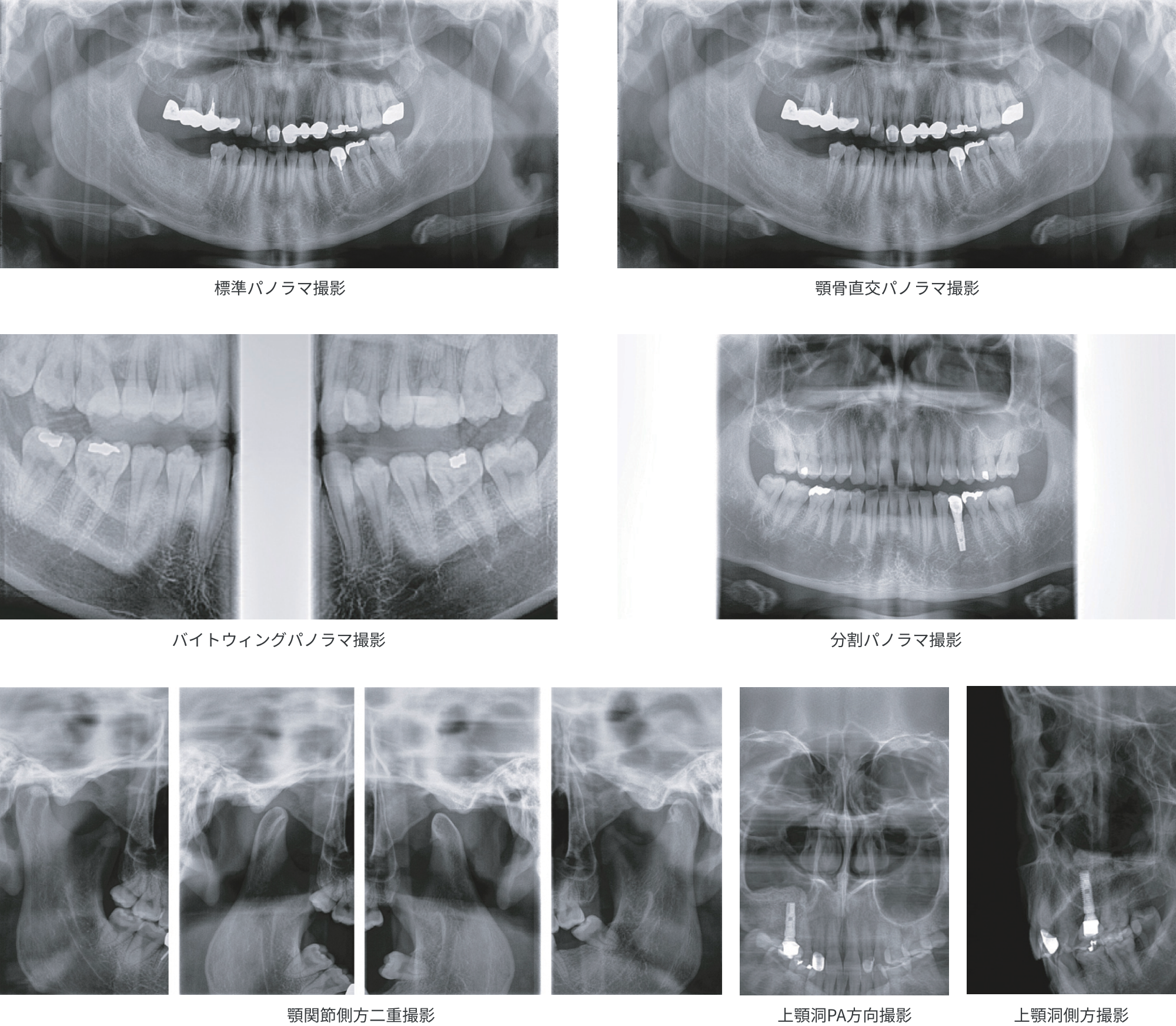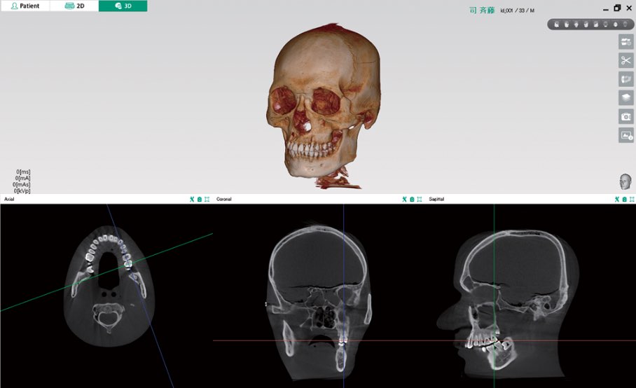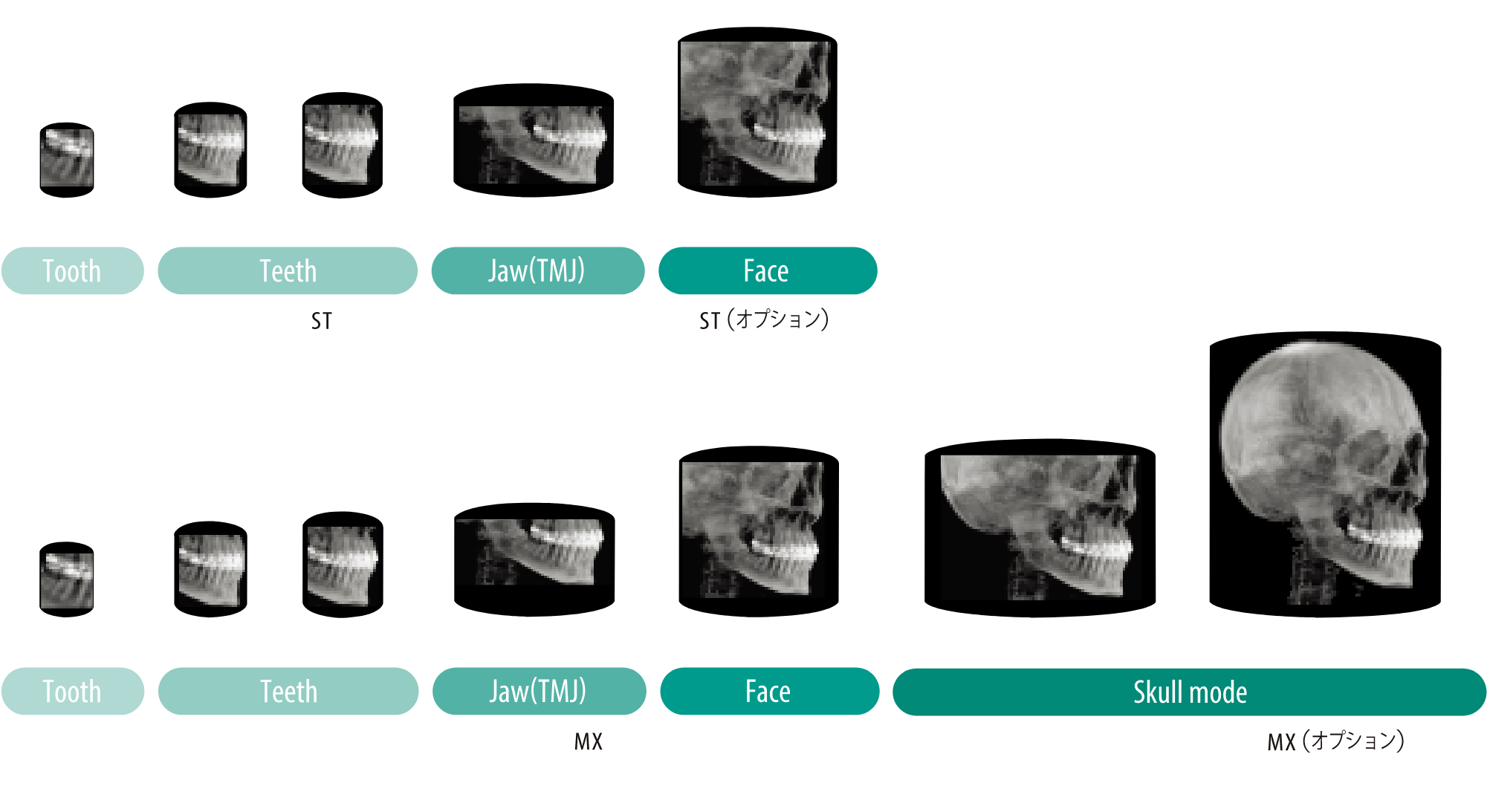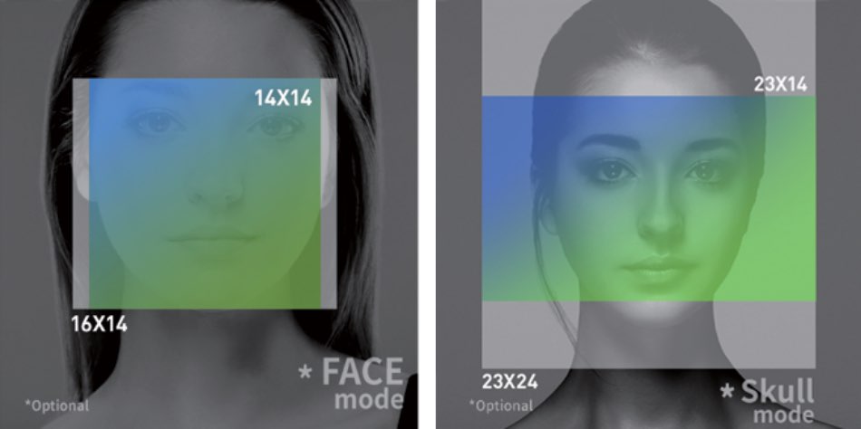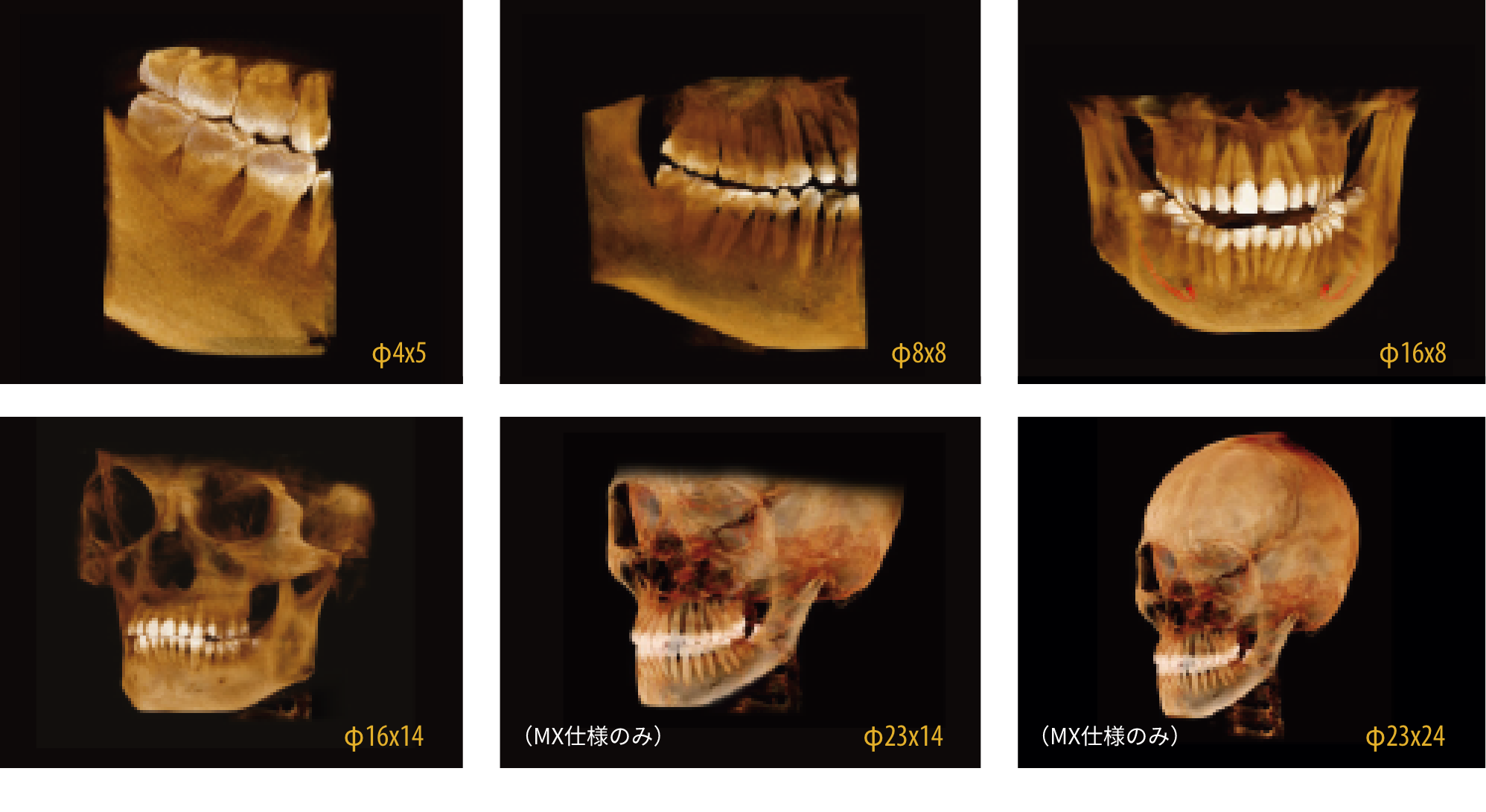 顔面全体、上顎洞、顎関節、顔面の非対称性の左右頬骨確認など、診断目的に応じてFOVサイズを選択することができます。単独のインプラント植立計画の範囲から、全頭蓋まで、極めて自由度が高い撮影装置です。