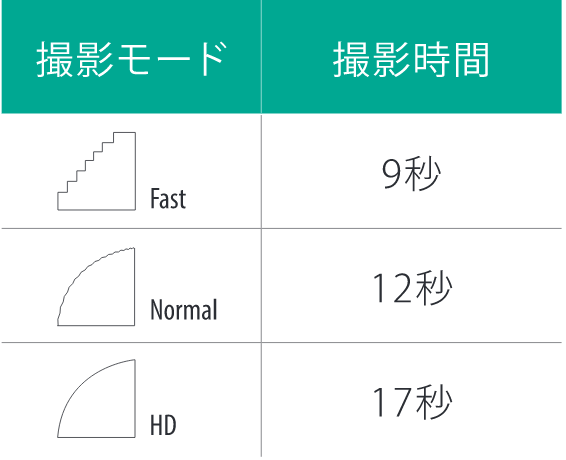 撮影モードは、Fast、Normal、HD(High-Definition)の3段階から画質を選択することができます。