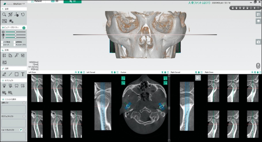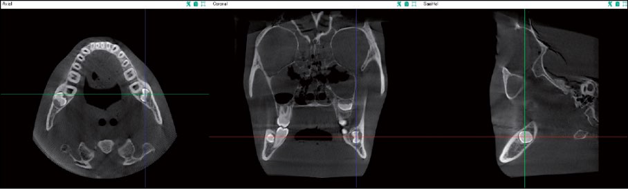 TMJビューアーでは、3Dボリュームレンダリング画像と左右顎関節のクロスセクション画像を同時に比較参照することができます。