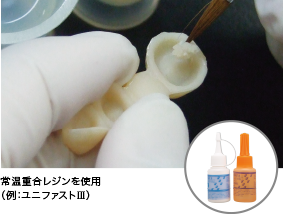 に装着して使用。支台歯形成前に採得した印象を用いることで、形態修正や研磨時間を大幅に短縮でき、安定したクオリティの高い暫間修復物が簡単に作製できます。またデュアルキュアタイプのため、最終重合を光照射で行うことにより、硬化時間を短縮することができます。