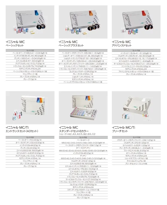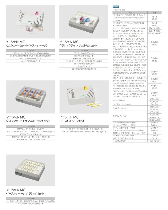 ・ペーストオペークモディファイヤー 6色(OM-1~6)3g各1本・ショルダーオペーク 3色(SO-37、38、39)20g各1本・ショルダートランスパ 7色(ST-30~36)20g各1本・オペーカスデンチン 16色(OD-A1~OD-D4)20g各1本・オペーカスデンチンモディファイヤー 2色(ODM-1、2)20g各1本・エナメルインテンシブ 4色(EI-11~14)20g各1本・トランスルーセントモディファイヤー 5色(TM-01~05)20g各1本・コレクションパウダー(COR)20g1本 ・グレーズリキッド25mL1本・ショルダーリキッド50mL1本・モデリングリキッド50mL1本 ・ベーシックプラスセット用シェードガイド3枚セット1個