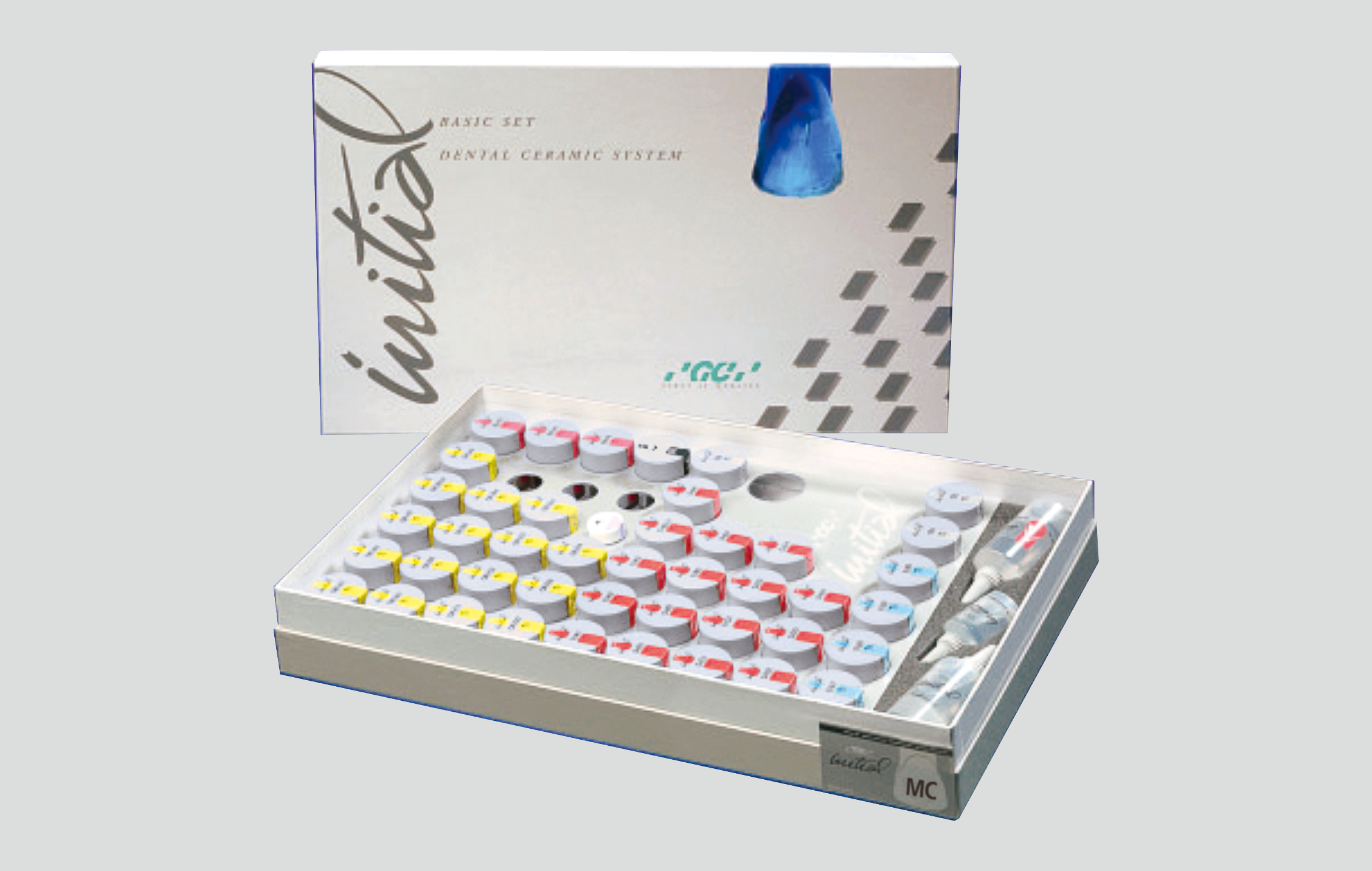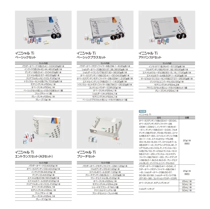 ・パウダーオペーク(O-A3)20g 1本 ・オペーカスデンチン(OD-A3)20g 1本 ・インサイド(IN-44)20g 1本 ・デンチン(D-A3)20g 1本 ・エナメル2色(E-58、59)20g 各1本 ・エナメルオパール(EOP-2)20g 1本 ・クリアフルオレッセンス(CL-F)20g 1本 ・オペークリキッド25mL 1本 ・モデリングリキッド25mL 1本 ・フリップチャート 1個 ・グレーズリキッド25mL 1本 ・グレーズ10g 1本