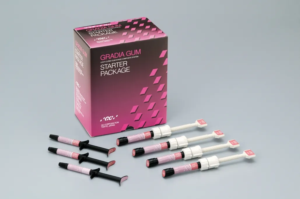 天然歯の歯肉に多く見られるオレンジ、ピンク系の色調を中心に設計した歯肉色用硬質レジンです。使用目的に応じた性状に設定されているため思い通りの歯肉表現が可能です。色調も豊富に用意してありますので多層築盛によって深みのある表現ができます。