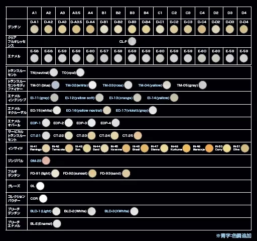 デンチン16色(D-A1~D-D4)、エナメル4色(E-57~60)、クリア フルオレッセンス(CL-F)、ブリーチデンチン3色(BLD-1、BLD-2、BLD-3)、ブリーチエナメル(BL-E)、インサイド11色(IN-41~51)、フルオデンチン3色(FD-91~93)、エナメルオクルーザル3色(EO-15、EO-16、EO-17)、エナメルオパール4色(EOP-1~4)、エナメルオパールブースター(EOP-B)、トランスルーセント2色(TN、TO)、サービカルトランスルーセント5色(CT-21~25)、トランスルーセントモディファイヤー5色(TM-01~05)、コレクションパウダー(COR)、エナメルインテンシブ4色(EI-11~14)、ジンジバル(GM-23) 各20g1本