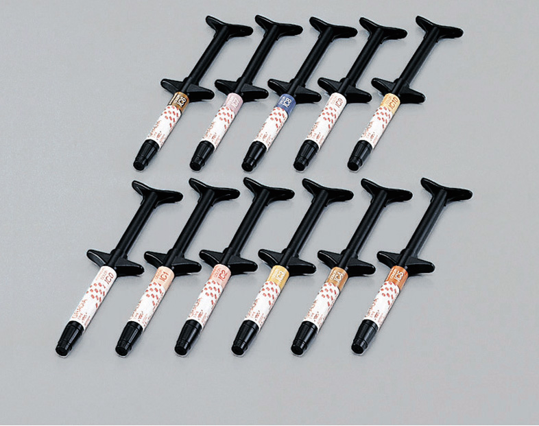 「グラディア」修復時に使用する効果色カラーのセットです。オペーク、デンチン、エナメルの各段階の内部ステインに用います。色調は比較的濃く設定。各色を混ぜることで思い通りの調整が行えます。インテンシブカラーはクリアーも含め15色ありますが、使用頻度の高い11色をセレクトしました。