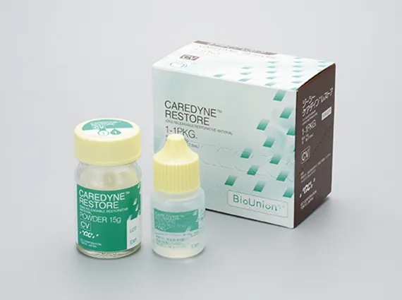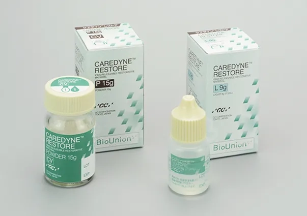 根面う蝕に対するケア、とりわけ高齢者の残存歯割合が高まる中、象牙質やセメント質中の有機質成分に対するキュアの重要性は増すばかりです。BioUnionテクノロジー※からうまれたケアダインレストアは、根面う蝕の充填はもちろん、防湿が難しい症例やコンポジットレジンと組み合わせた治療を行うことにより患者さんのう蝕ケアにお応え致します。 ※BioUnionテクノロジーとは ジーシーが長年培ってきたグラスアイオノマーのテクノロジーを、イオンの働きによる生体との調和を目的に発展させたテクノロジーです。ケアダインレストアは、新しい機能性フィラー"BioUnionフィラー"を配合し、充填部位でフッ化物イオン、亜鉛イオン、カルシウムイオンを放出します。管理医療機器 歯科充填用グラスポリアルケノエートセメント 230AKBZ00013000
