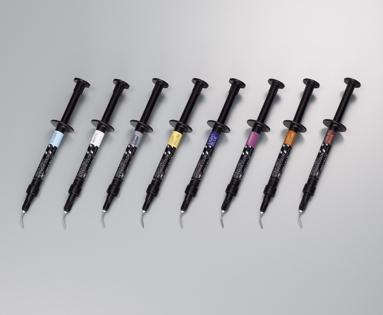 グラディアダイレクトのエナメル、トランスルーセントの下に用いる「光重合型の内部ステイン」です。基本色では対応できない白帯やクラック、小窩裂溝などのさまざまな色調を再現することができます。低粘性のため、混色しやすく、筆や探針などによる塗布も容易です。