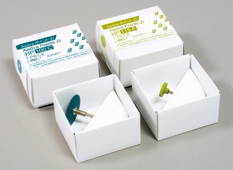 「高強度ジルコニア」の調整・研磨が効率的に行えるダイヤモンド砥粒を高密度に配合したポイントです。3種類の形態で2種類の粗さがあります。