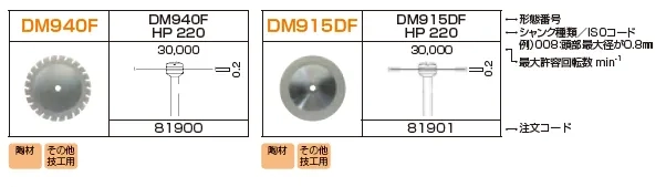高品質の天然ダイヤモンド砥粒を優れた加工法で機能的なデザインに仕上げているため、耐久性と切削効率に優れています。DM943DC080/100(HP用)は、直径が小さいためダイヤモンドバーでは難しい密接した隣接面の形態修正や鼓形空隙の付与等、様々な場面で快適に使用できます。レストやファイバーカットには、DM940F220、DM915DF220(HP用)をご使用ください。