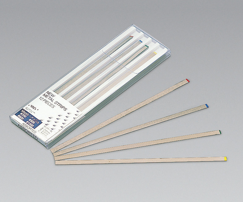 18-8ステンレス箔に、微細なアランダム砥粒を電着法で確実に固定した 「ニューメタルストリップ」。荒けずり用から最終仕上げ用まで、4種類の粒 度をライナップ。薄さとしなやかさを合わせ持ち、隣接面のカーブに 自在に合せられます。しかも、“コシ”はしっかりしているため、歯間への挿 入がスムースで研磨力も強く、効率の良い形態修正・研磨作業が行えます。 また歯間分離や支台歯形成時にも使用できます。