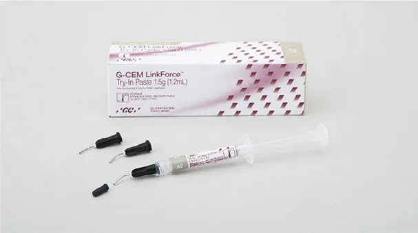 ジーセム リンクフォース レジンセメント 色調 4色=トランスルーセント、A2、AO3、ブリーチ 包装 1函=シリンジ8.7g(5mL)1本、EM ミキシングチップT15個、EMミキシングチップF5個、EMミキシングチップF用ノズルRC 5個…各