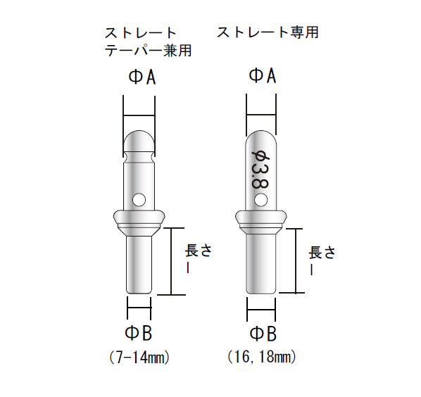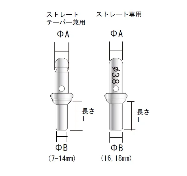| 寸法 (mm) | φ3.8 7-14mm テーパー・ストレート兼用 | φ3.8 16、18mm ストレート専用 | φ4.4 7-14mm テーパー・ストレート兼用 | φ4.4 16、18mm ストレート専用 | φ5 7-16mm ストレート兼用 |