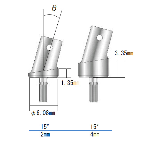 アングルセレクター ANGLED SELECTOR 製品概要 アングルカスタムアバットメントを適用するときのアングル選択に使用します。φ3.8、4.4は共用、アングルは15°と25°の種類、カラー部高さは2mm、4mmの2種類からの選択になります。 ※Oリング装着済 ※交換用Oリング5個付 材質 チタン合金 種類・寸法 ss
