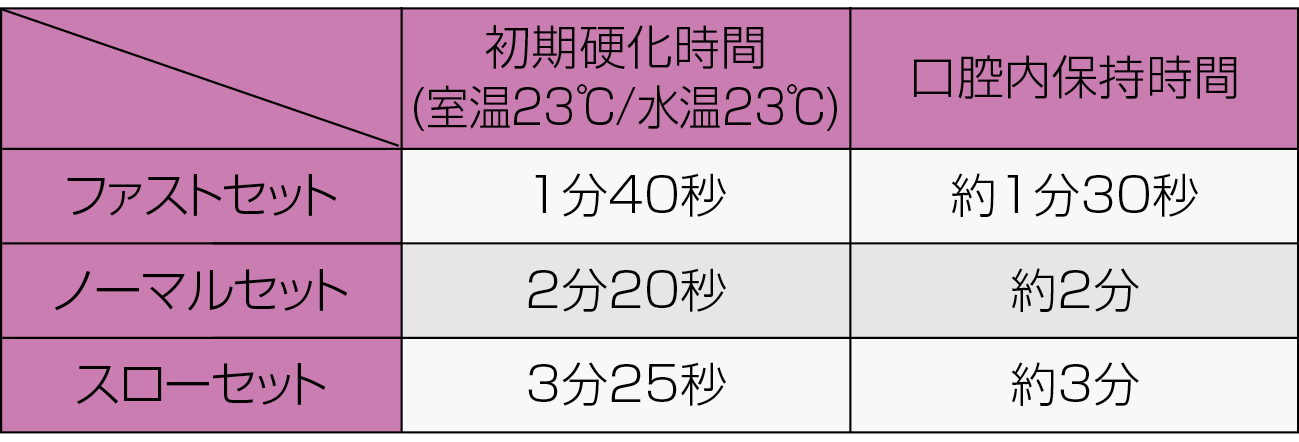 ※口腔内保持時間はノーマルセット:約2分、ファストセット:約1分30秒、スローセット:約3分です。