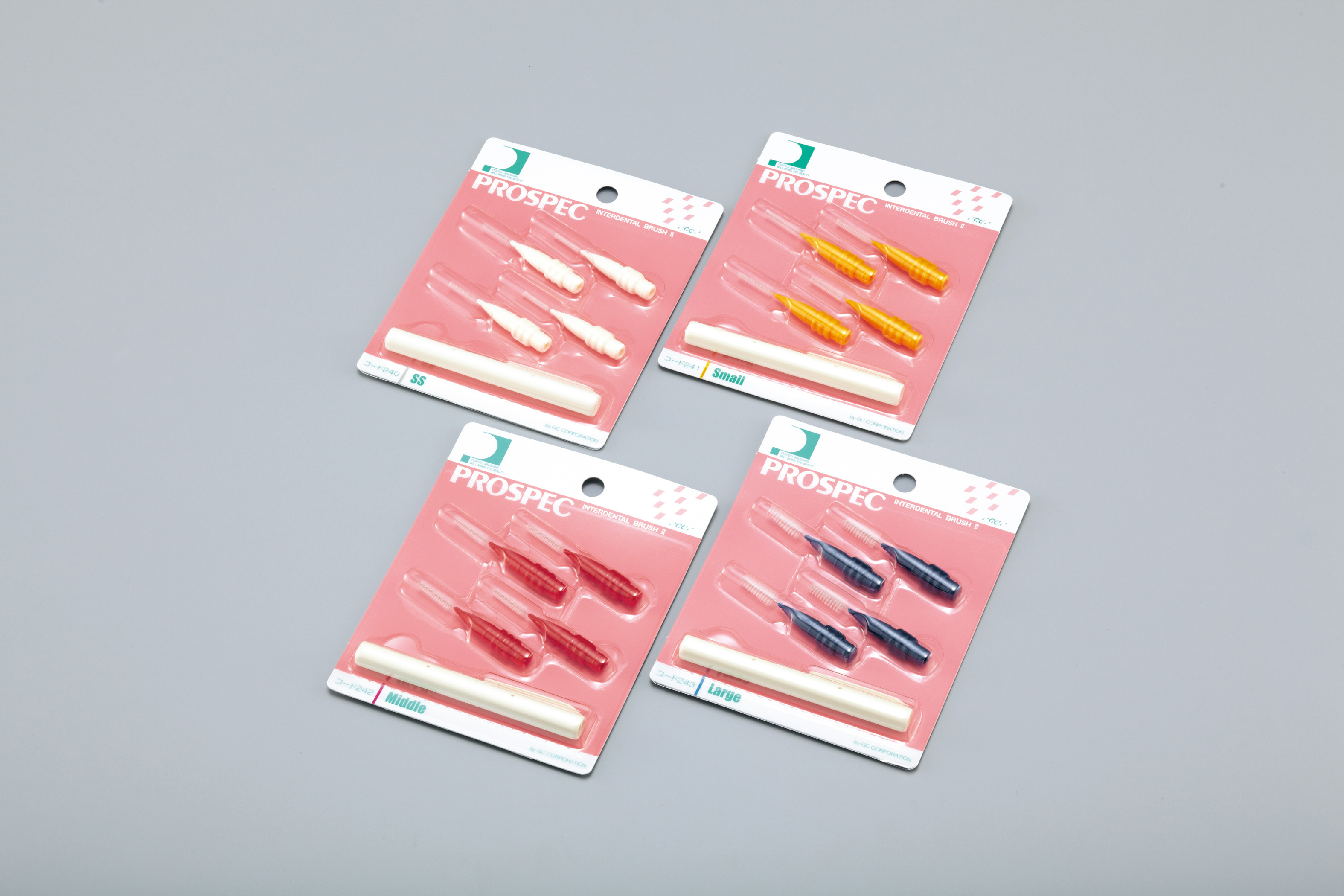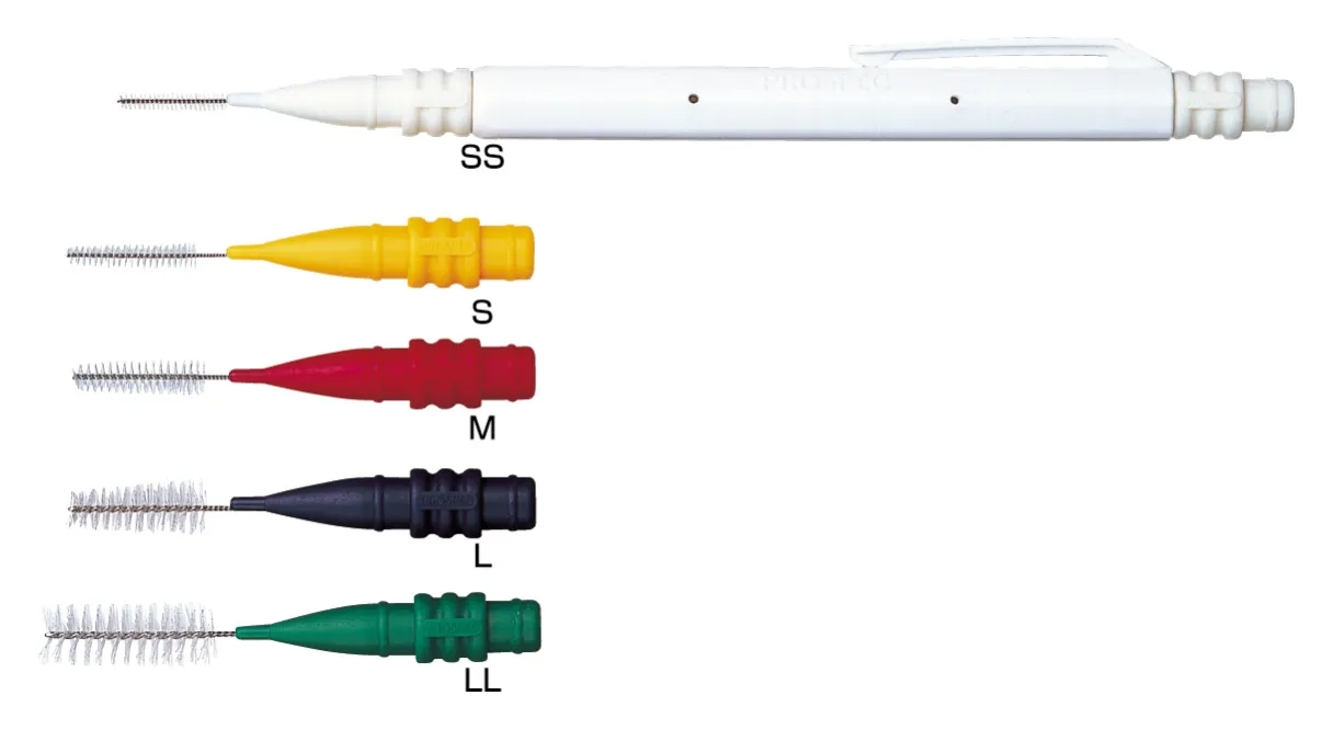 プロスペック®歯間ブラシII 歯間ブラシ PROSPEC® INTERDENTAL BRUSH II 製品概要 臼歯部の歯間にもラクに届く歯間ブラシ ネックは曲げに強く、耐久性抜群の軟性樹脂でカバーしています。 ** 寸法/ 仕様 種類 4種=SS(極細・ホワイト)、S(細・イエロー)、M(中・レッド)、L(太・ブルー) 包装 各種1函=1パック(ブラシ4本、スリーブ1本)×6パック 〈希望患者価格 1パック=680円(税込)〉 セミナー 関連製品 プロスペック®歯間ブラシII スペアー この製品に関するよくある質問 製品Q&A(よくある質問) ダウンロード その他 歯間ブラシII 寸法/仕様
