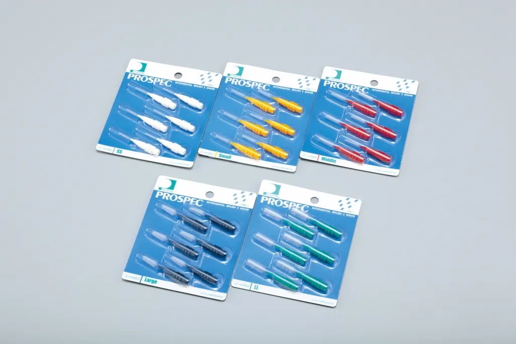 プロスペック®歯間ブラシII スペアー 歯間ブラシ PROSPEC® INTERDENTAL BRUSH II SPARE 製品概要 歯間ブラシIIのスリーブをお持ちの方に便利なブラシのみの大容量タイプ 1本のスリーブで太さの異なる複数のブラシを併用する方にもおすすめです。 ** 寸法/ 仕様 種類 5種=SS(極細・ホワイト)、S(細・イエロー)、M(中・レッド)、L(太・ブルー)、LL(特太・グリーン) 包装 各種1函=ブラシ6本入1パック×6 〈希望患者価格 1パック=850円(税込)〉 セミナー 関連製品 プロスペック®歯間ブラシII この製品に関するよくある質問 製品Q&A(よくある質問) ダウンロード その他 歯間ブラシII 寸法/仕様