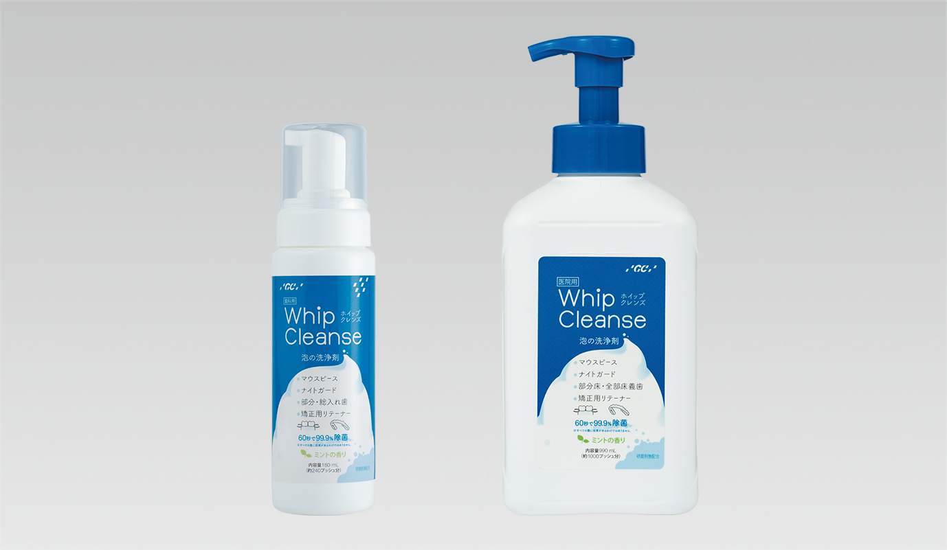 きめ細かいホイップ泡が汚れに密着し、60秒磨くだけで99.9%の除菌効果※が得られます。研磨剤無配合のため、口腔内装置を傷つけにくく、やさしくお手入れすることができます。すっきりとしたミントの香りが残るので、院内での調整後の洗浄にもおすすめです。