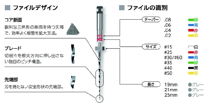 形状記憶効果をもつマルテンサイト相(M相)のNiTiロータリーファイルです。独自のヒートトリメントテクノロジーにより、ねじり疲労破折抵抗性が1.5倍、周期疲労破折抵抗性が3.2倍に向上し、破折リスクを軽減しました。