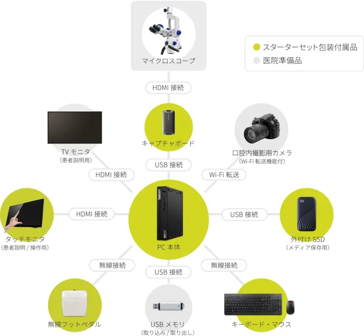 スターターセットタッチパネルモニタ24/22インチ付:PC本体、電源ケーブル、マウス、 キーボード、USBスピーカー、キャプチャボード(HDMI→USB変換ケーブル)、外付けSSD (1TB)、USBハブ(4ポート)、フットペダル(無線タイプ)、マルチタッチ式ワイド 液晶モニタ 24/22インチ、マルチタッチライセンス、HDMI分配器(1入力/2出力)4K対応、HDMI ケーブル 1m