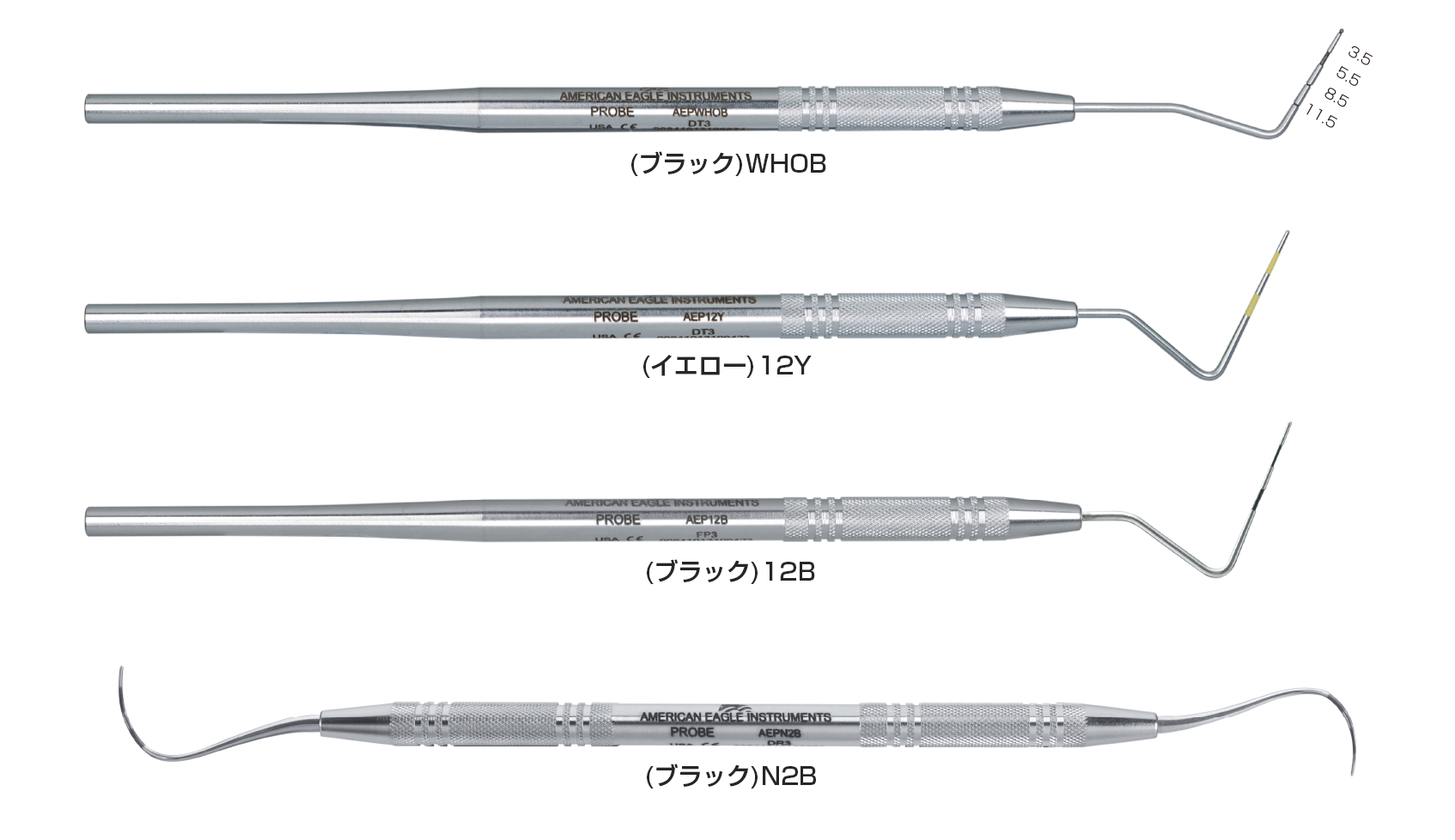 「プローブ(イエロー)12Y」は独自のマーキングシステムで、ポケット測定時の視認性が良くなっています。「プローブ(ブラック)N2B」は根分岐部用です。