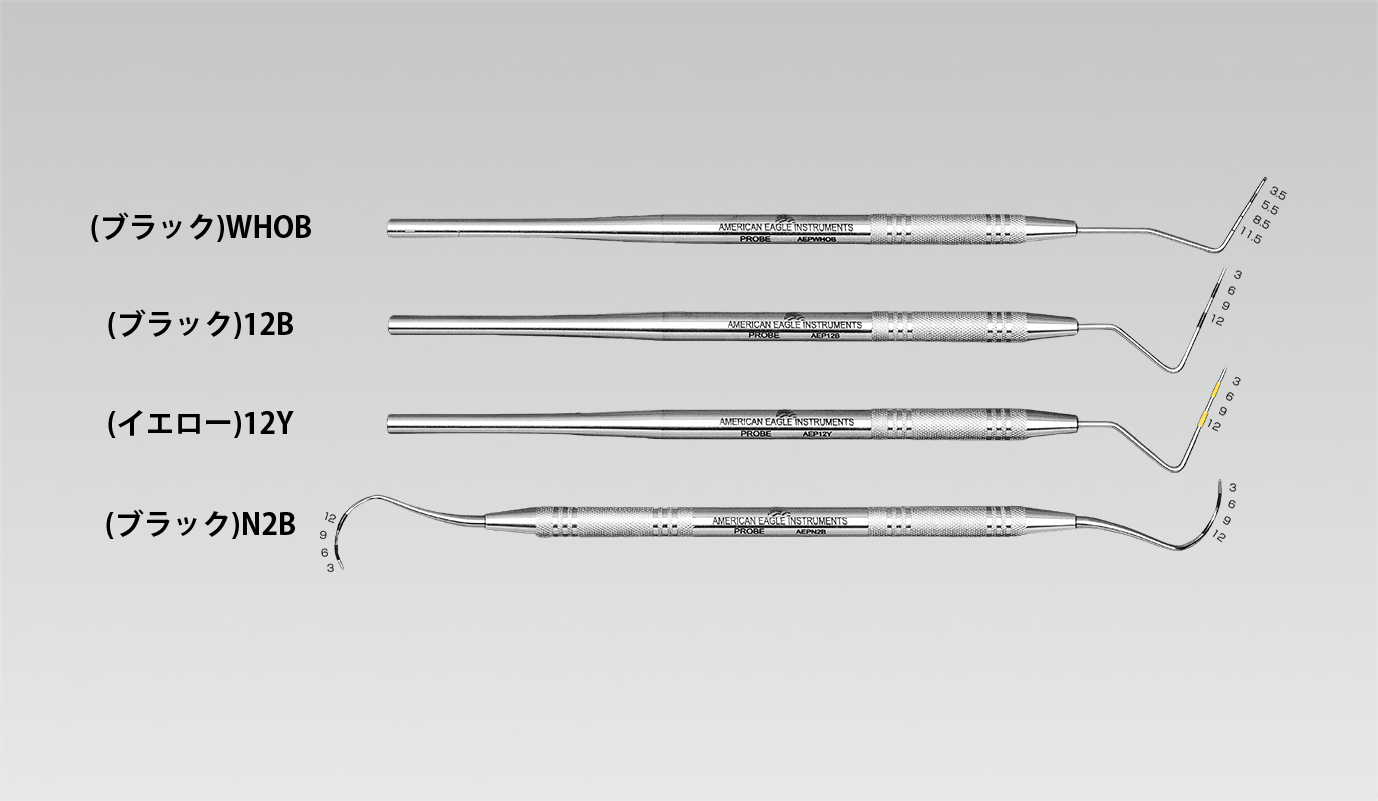 「プローブ(イエロー)12Y」は視認性を高める独自のマーキングシステムで、「プローブ(ブラック)N2B」は根分岐部用です。