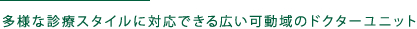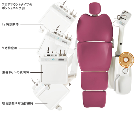 9〜12時の診療ポジショニング時においては、スライドデリバリータイプ・フロアマウントタイプともに同等の使用感が可能です。フロアマウントタイプにおいてはドクターユニットとチェアの接続固定位置を追求することで様々なポジショニングを実現し、ストレスフリーな診療を行えます。
