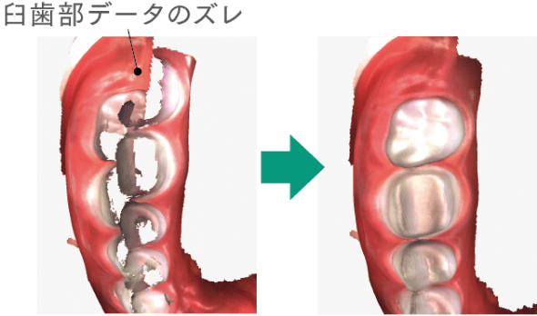 4DRテクノロジーにより、唾液や光の反射、カメラの動きにより生じるブレやノイズを除去し、正確な歯の形状再現を可能にしています。