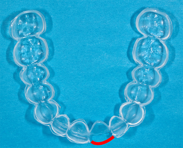 このようなリスクを防ぐためには、インプラントが入っている部分に薬剤が触れたり、漏れたりしないよう、マウスピースのデザインを工夫することが大切です。例えば、下の写真のマウスピースはインプラントが入っている部分(赤線の部分)を削除することで、物理的にホワイトニングの薬剤が入らない設計になっています。