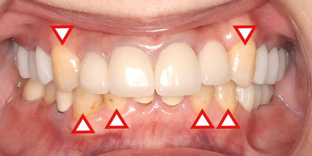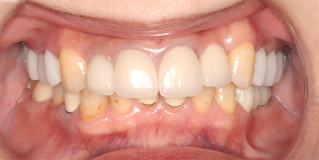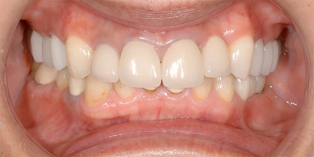 こちらの患者さんは、右上の前歯(側切歯)の被せものが外れてしまい来院されました。前歯の治療と同時に、10年以上前にインプラントに装着した左上の側切歯の被せ物を含め、他の歯の被せ物も新しく入れ替える治療を希望されました。患者さんの望む白さで被せ物を入れ替えたところ、糸切り歯や下の前歯など、ご自身の歯(天然歯)の色が目立つようになってしまいました。