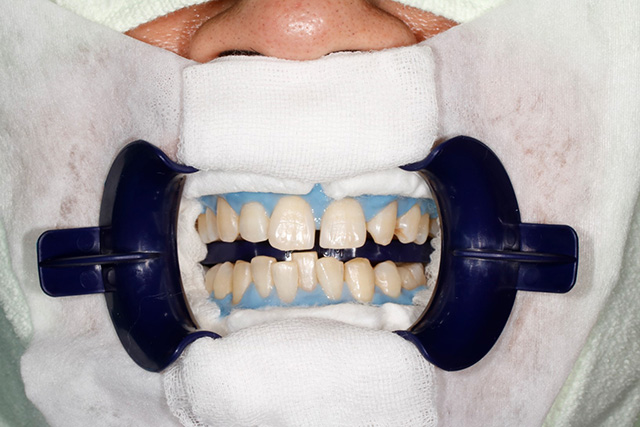 オフィス・ホワイトニングは、歯科医院で歯科医師や歯科衛生士が薬剤を歯に塗って行う方法です。この場合は、施術を行う医療従事者が、薬剤をインプラントの金属部分や歯ぐきに触れないよう配慮します。具体的には、薬剤を塗る前にインプラントの周囲や歯ぐきを専用の保護材でしっかり覆うことで、薬剤の接触を防ぐことができます。下の写真では、青い保護材でインプラントの金属部分をバリアして薬剤が侵入しないようにしています。なお、使用するホワイトニング剤によって保護材の色は異なります。