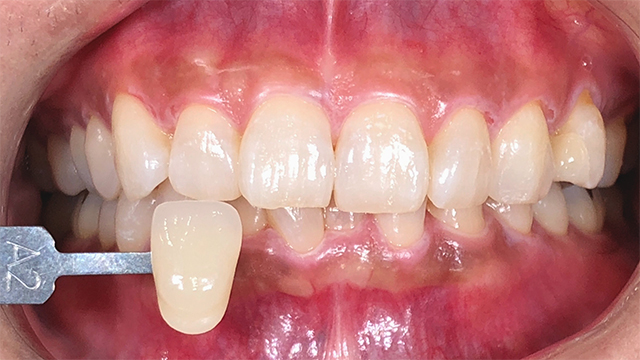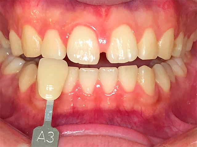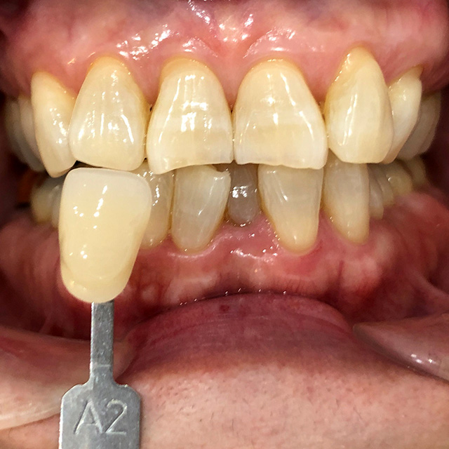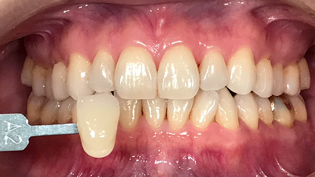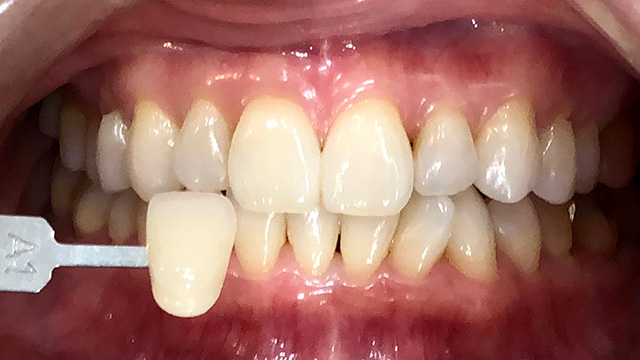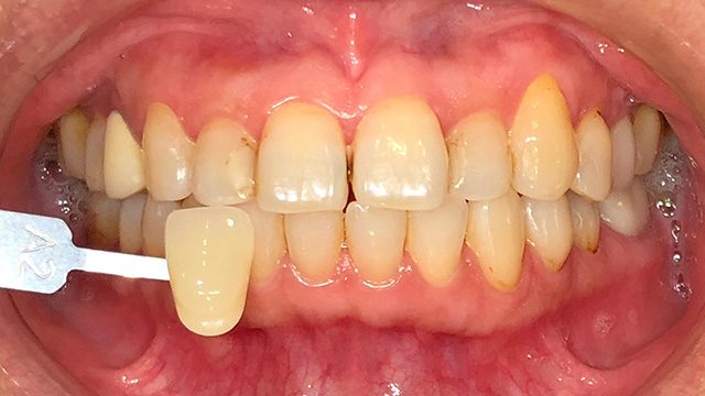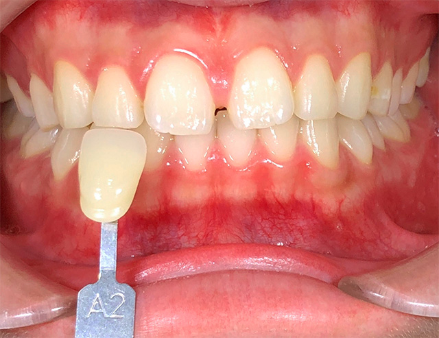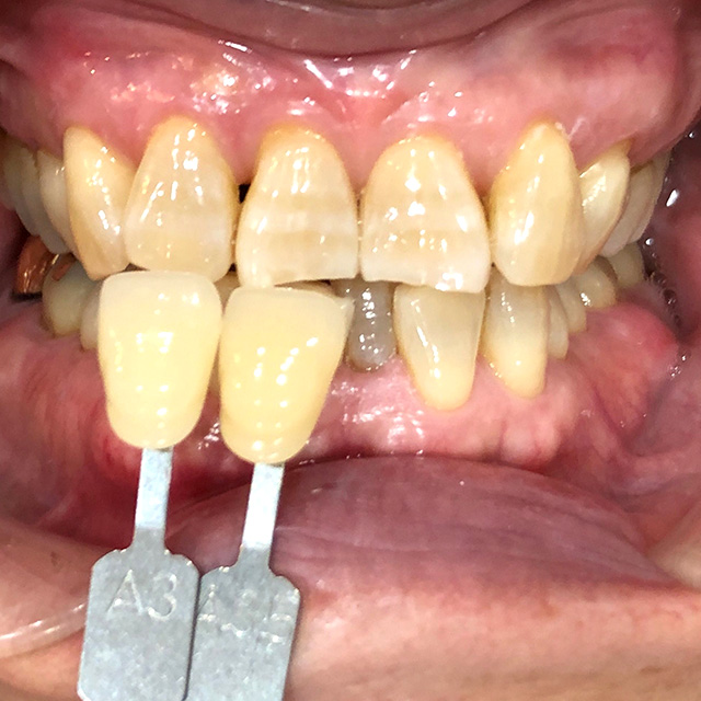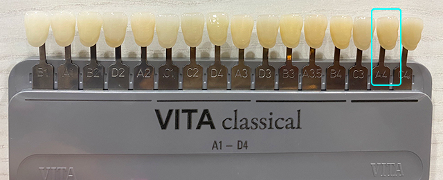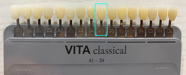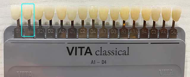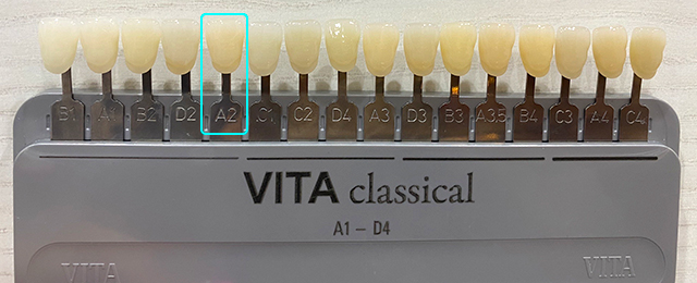 治療の結果、A2という色になりました。A2はA3に比べ、黄色み、赤みが抜けて、明るい色です。