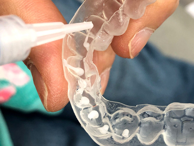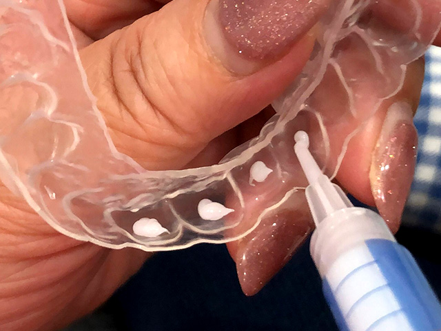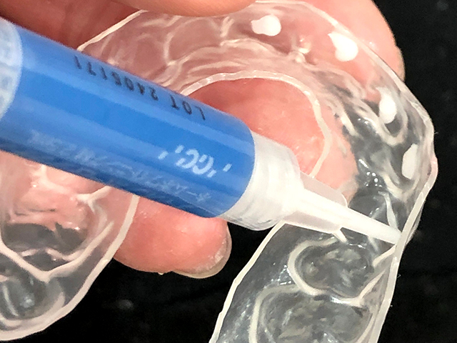 2つ目は、ホームホワイトニング※2で、診療室で使い方を患者さんにお伝えし、ご自宅など歯科医院以外の場所で専用のマウスピースを装着して歯を白くする方法です。手順としては、まずは診療室で診査診断後、マウスピースの型を採ります(30分)。その型を使ってマウスピースを制作し、数日後に薬剤とマウスピースのお渡しと使い方の説明で再度ご来院いただきます(30分)。そこから毎日1~2時間、10~14日間続けて薬剤を入れたマウスピースを装着していただき2週間後にどのくらい白くなったか確認でご来院いただきます(30分)。装着時間と日数は、歯科医師の診断や使用する製品などで異なりますが、トータルの期間としては約1か月が目安になります。