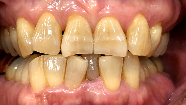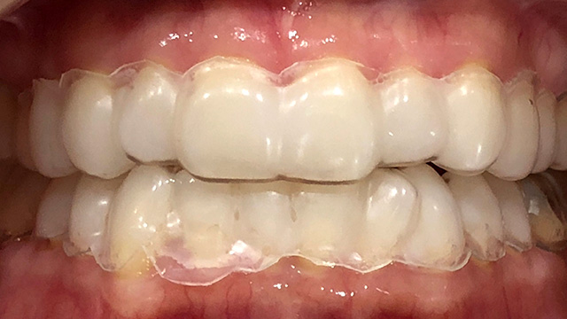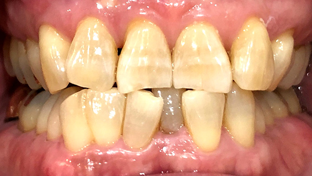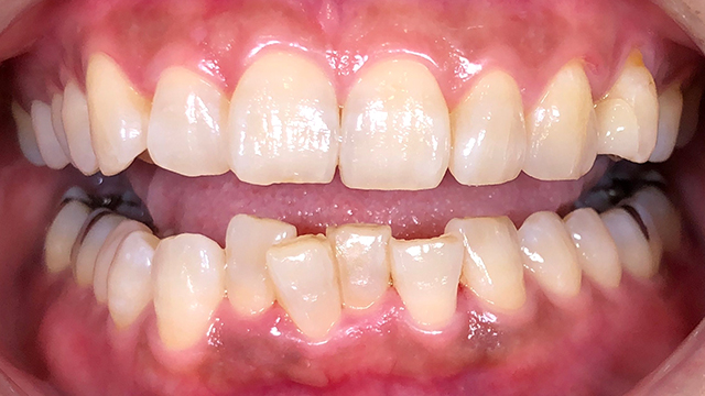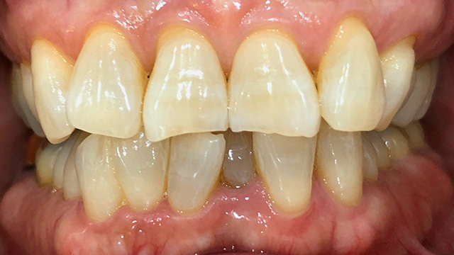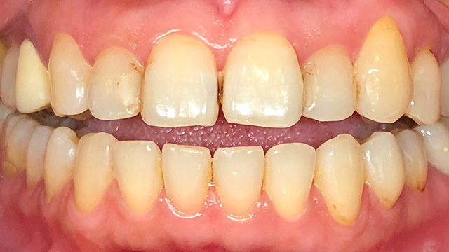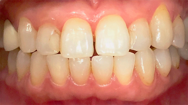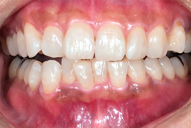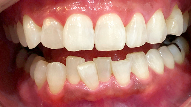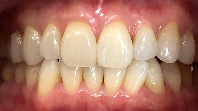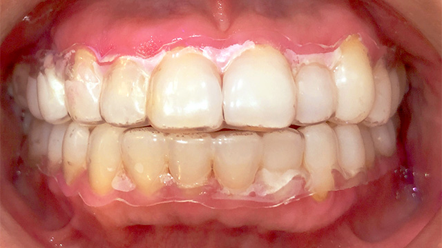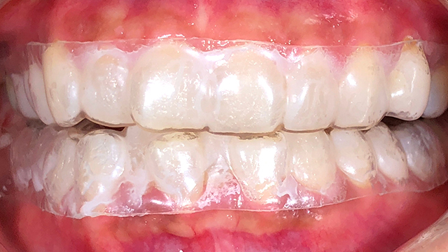 14日間を過ぎた段階でご来院いただきましたが、目標の白さまで到達していませんでした。患者さんに使用状況を確認したところ、薬剤の使用量を誤解されており、少ない量で使用されていたことがわかりました。ホームホワイトニングの効果を得るためには、適正な量の薬剤を入れたマウスピースを毎日装着することが重要です。歯科医師が診断し、知覚過敏症状は無かったので、使用量を再度患者さんと確認し追加で7日間ホームホワイトニングを続けることとなりました。