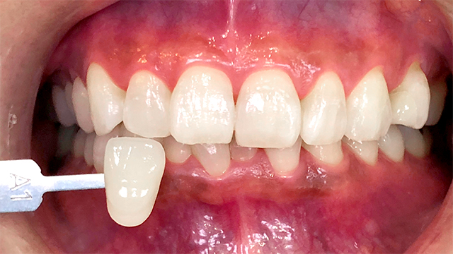 最終的には、目標とした白さのA1になりました。A1はA2よりも更に赤みと黄色みが減り「この人は歯が白いな」と感じる色です。非常に明るい白さですが、自然感もあり医療ホワイトニングの目標として患者さんが希望されることが多い歯の色です。