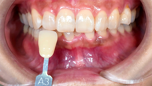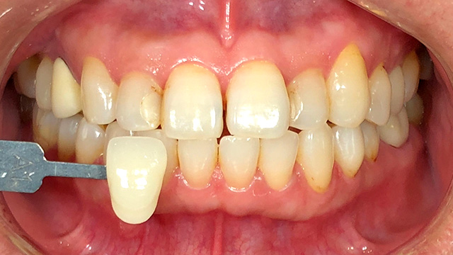 こちらの方は、シェードガイドでは水色で囲ってあるA3という色でした。一般的な日本人の歯の色ですが、やや黄色いと感じる方もいます。患者さんの希望と、歯科医師による診査診断から、まずは14日間ホームホワイトニングを実施する治療計画を立てました。