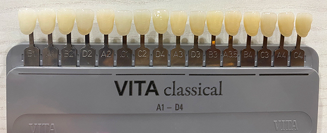 ホワイトニングの治療効果は、こちらの「シェードガイド」を用いて確認します。これは被せ物など人工の歯を作る際に用いる歯の色見本で、同じ形の前歯が並んでいます。これを白い順(明度順)に並び替えることで、歯の白さを評価する指標として用います。また、1本ずつ金属の棒に固定されており、抜き差しできるので、近い色のシェードガイドを選んで歯の写真で一緒に写すことで、術前術後や途中経過の色を記録するためにも使われます。